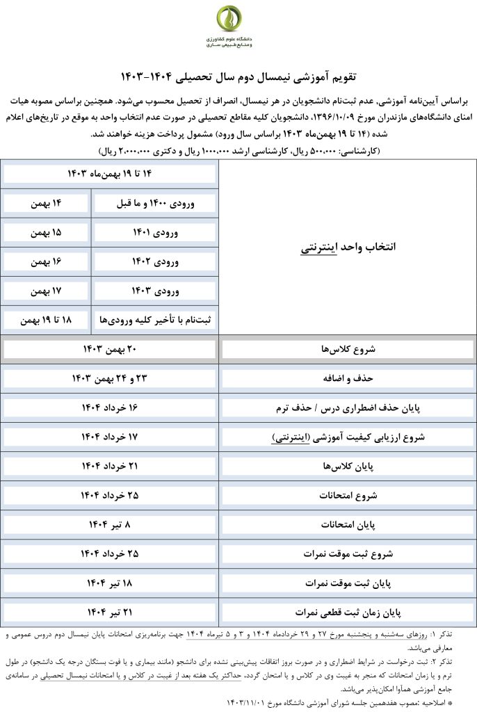 اصلاحيه تقويم آموزشي نيمسال دوم سال تحصيلي 1403-1404
