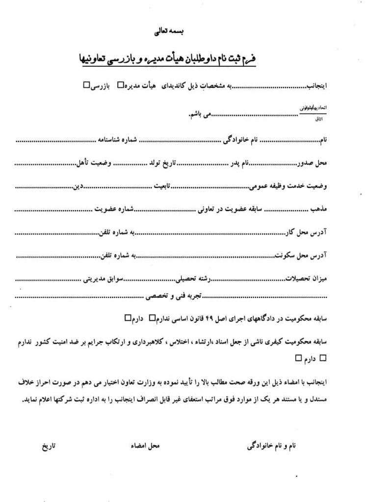 وی در پایان افزود: اعضا متقاضی برای کاندیدای هیات مدیره و بازرس تعاونی مصرف لطفا حداکثر تا پایان ساعت 13 روز دوشنبه 7 آبان ماه 1403نسبت به تکمیل فرم ثبت نام پیوست اقدام و به دبیر شورای صنفی کارکنان تحویل نمایند.