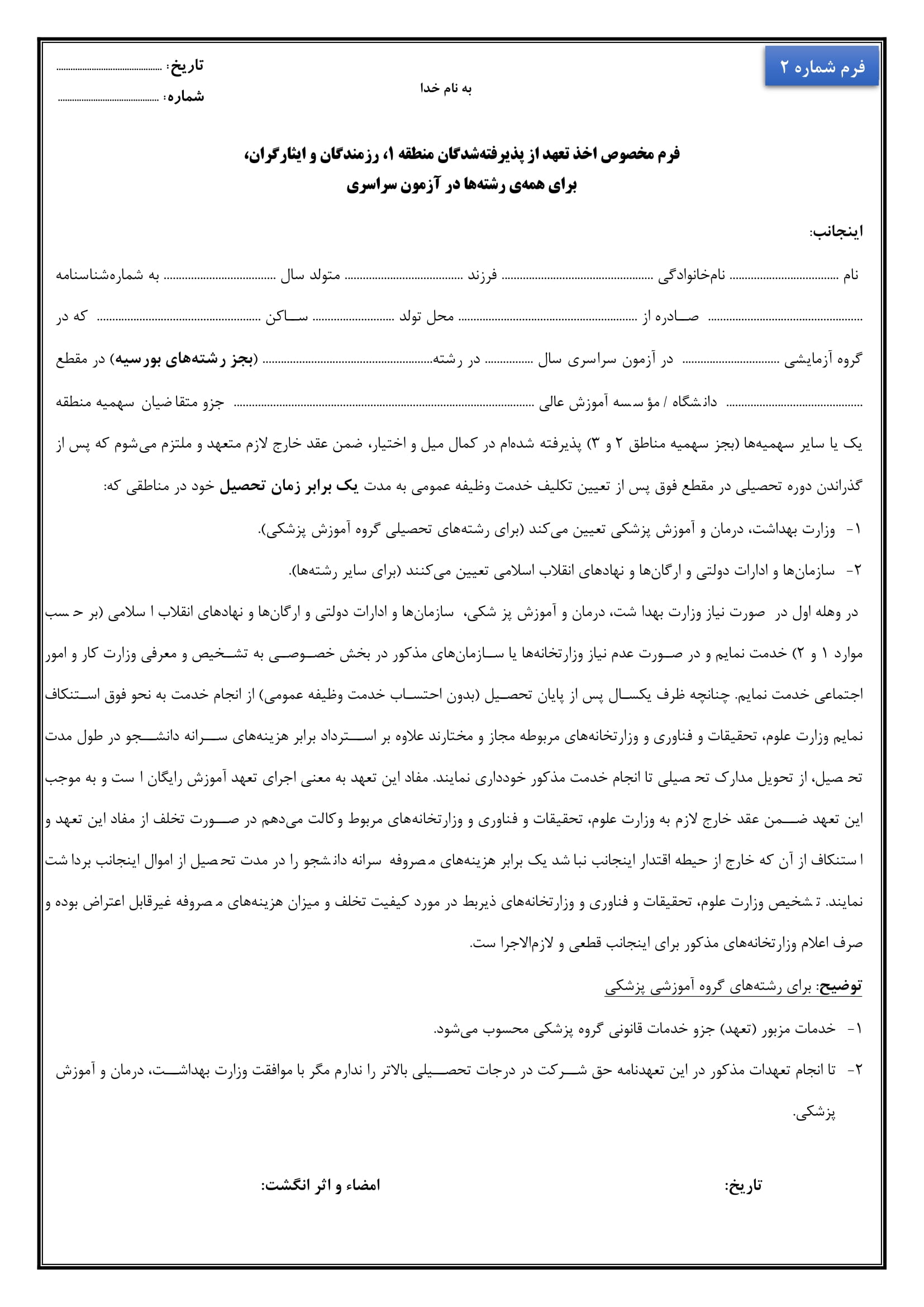 - فرم شماره 2- فرم مخصوص اخذ تعهد از پذيرفتهشدگان منطقه 1، رزمندگان و ايثارگران، براي همهي رشتهها در آزمون سراسري