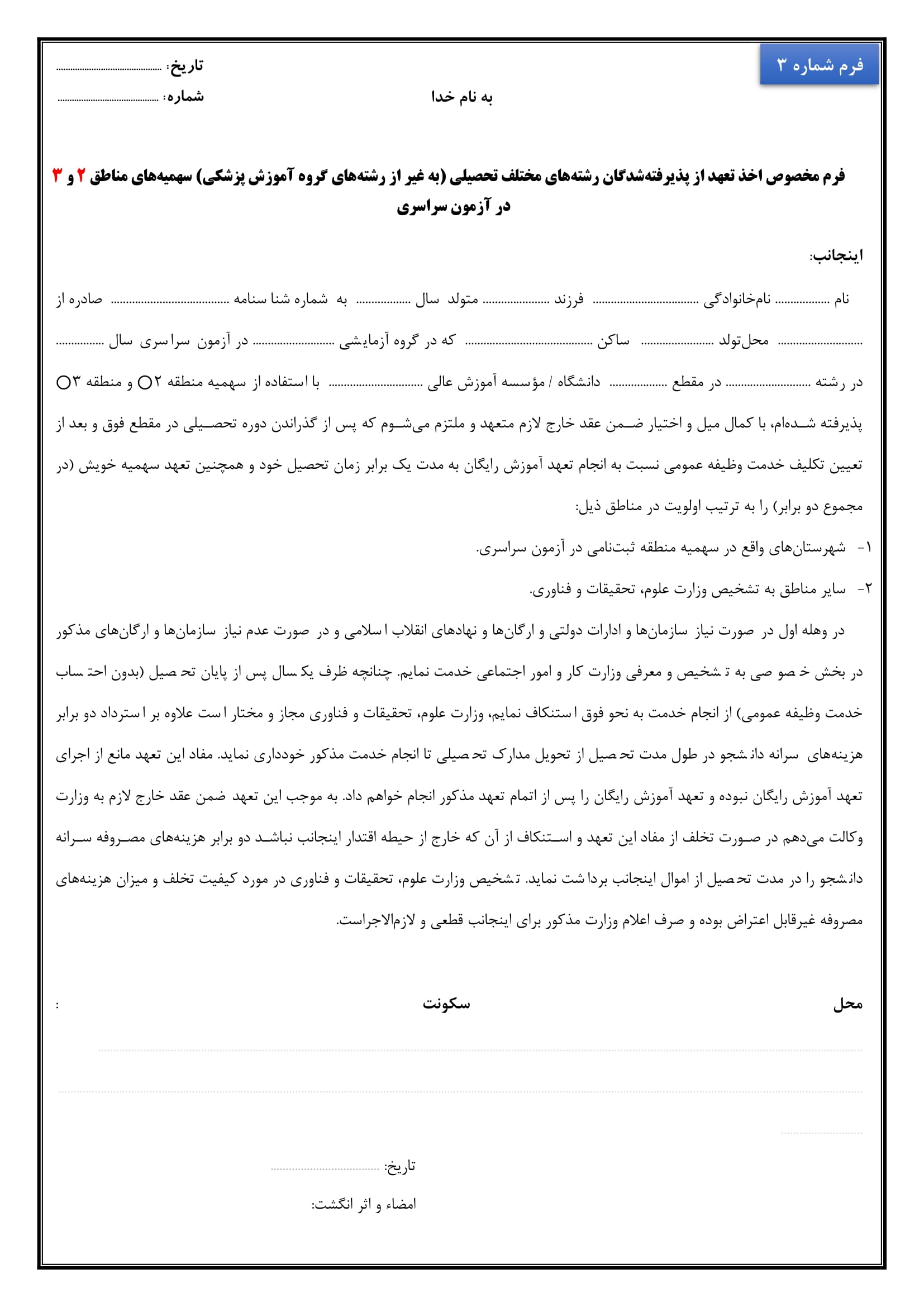- فرم شماره 3- فرم مخصوص اخذ تعهد از پذيرفتهشدگان رشتههاي مختلف تحصيلي (به غير از رشتههاي گروه آموزش پزشكي) سهميههاي مناطق 2 و 3 در آزمون سراسري