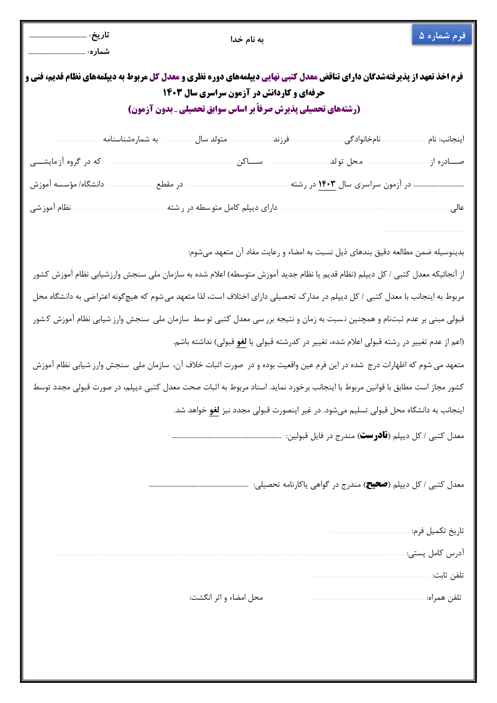 - فرم شماره 5- فرم اخذ تعهد از پذيرفتهشدگان داراي تناقض معدل كتبي نهايي ديپلمههاي دوره نظري و معدل كل مربوط به ديپلمههاي نظام قديم، فني و حرفهاي و كاردانش در آزمون سراسري سال 1403 (رشتههاي تحصيلي پذيرش صرفاً بر اساس سوابق تحصيلي بدون آزمون)