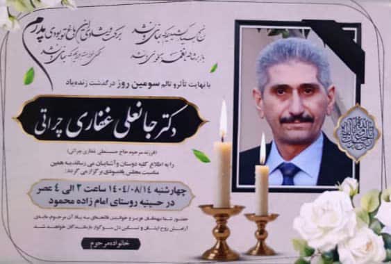 همکار بازنشسته دانشکده علوم دامی و شیلات مرحوم دکتر جانعلی غفاری چراتی عضو هیات علمی بازنشسته دانشگاه علوم کشاورزی و منابع طبیعی ساری دار فانی را وداع گفت.