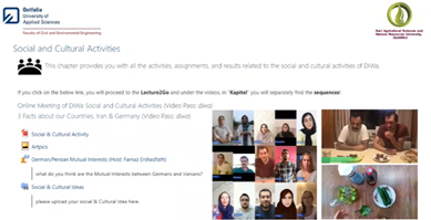 در ادامه مهندس نیایش فندرسکی به بررسی جامع و کامل فعالیت های متفاوت در پروژهی DiWa در پلتفرم آنلاین moodle شامل درس ها، تکالیف، فعالیت های فرهنگی، ارزیابی ها و … پرداخت.