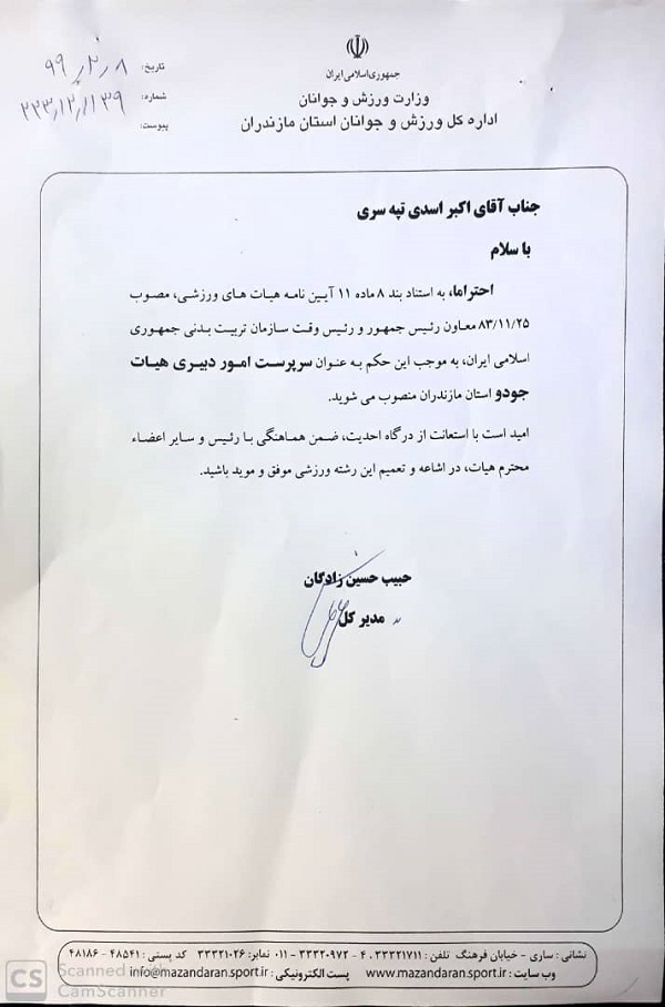 به گزارش روابط عمومی و به نقل از مدیر امور تربیت بدنی دانشگاه، حبیب حسین زادگان مدیر کل ورزش و جوانان استان مازندران طی حکمی اکبر اسدی تپه سری را به عنوان دبیر هیات جودو استان مازندران منصوب نمود.