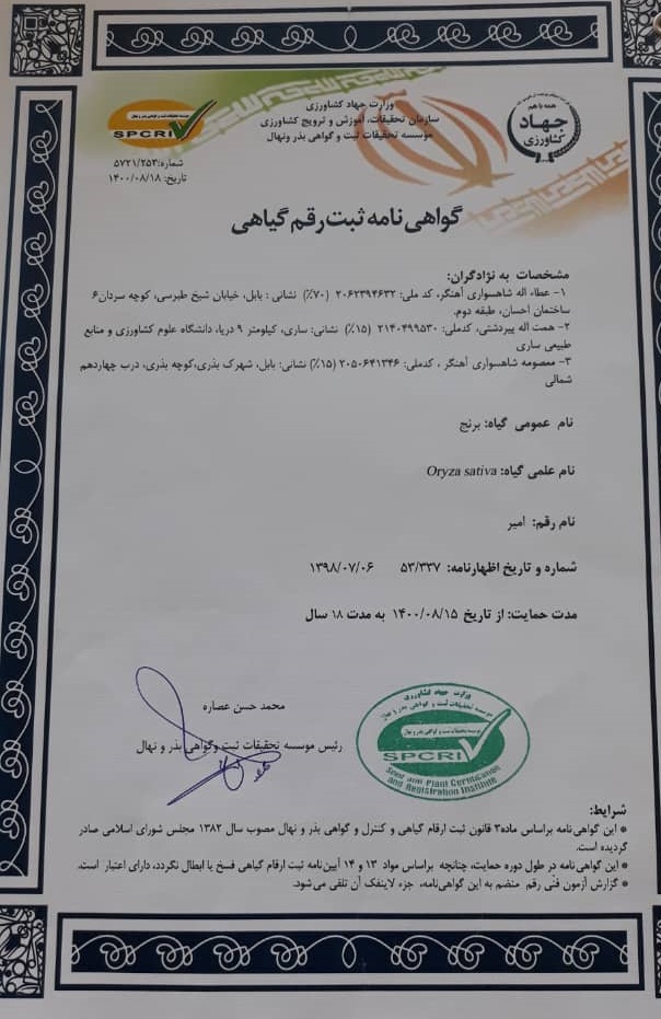 برنج “امیر” با تلاش پژوهشگران دانشگاه توسط موسسه تحقیقات ثبت و گواهی بذر و نهال به عنوان رقم جدید برنج ثبت شد