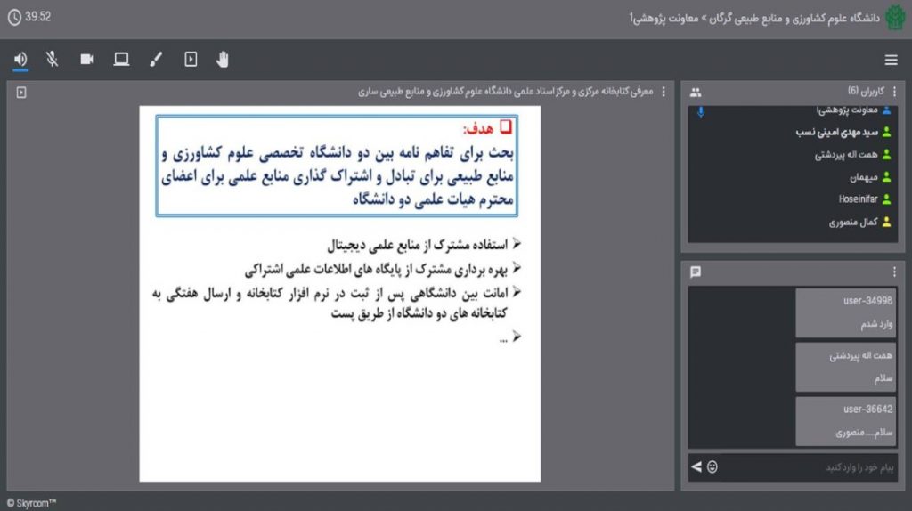 این جلسه مجازی با هدف بحث و تبادل نظر برای ایجاد تفاهم نامه بین دو دانشگاه تخصصی علوم کشاورزی و منابع طبیعی برای تبادل و اشتراک گذاری منابع علمی برای اعضای هیات علمی دو دانشگاه تشکیل گردید و مقرر شد پیش نویس تفاهم نامه برای بهره برداری مشترک اعضای هیات علمی دو دانشگاه از منابع علمی دیجیتال، پایگاه های اطلاعات علمی اشتراکی، طرح امانت بین دانشگاهی کتب و …. تهیه، بررسی و نهایی شود.
