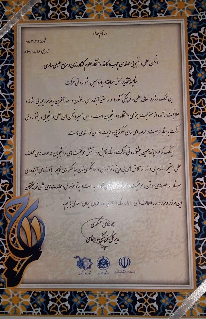 تقدیر از انجمن علمی دانشجویی مهندسی چوب و کاغذ در یازدهمین جشنواره ملی حرکت