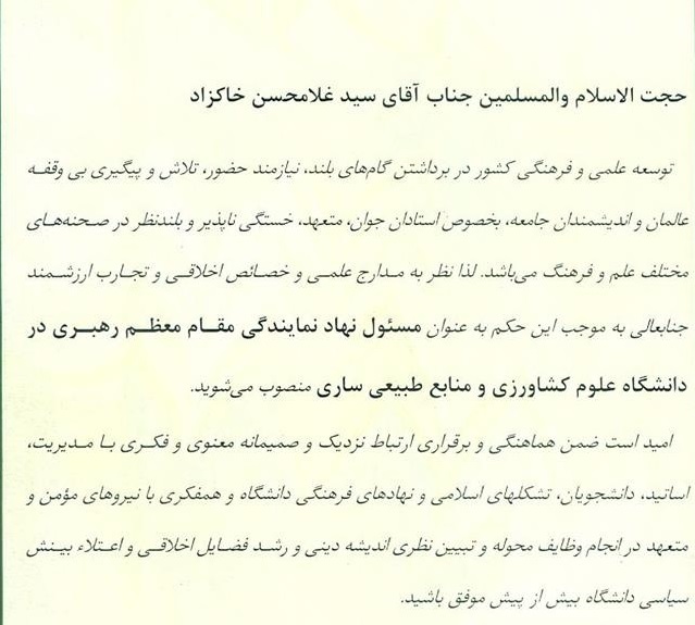 به گزارش روابط عمومی دانشگاه، حجت الاسلام محمد محمدیان رئیس شورای نمایندگان مقام معظم رهبری در دانشگاه ها طی حکمی حجت الاسلام سید غلامحسن خاکزاد بعنوان مسئول نهاد نمایندگی مقام معظم رهبری در دانشگاه علوم کشاورزی و منابع طبیعی ساری منصوب نمود.