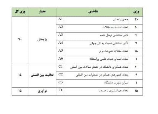 معاون پژوهش و فنآوری دانشگاه اظهار داشت: این مدارک بر اساس سه معیار کلی پژوهش (با وزن 70 درصد)، فعالیت بینالمللی (با وزن 15 درصد) و نوآوری (با وزن 15 درصد) ارزیابی شده اند. شاخص های موثر در این رتبه بندی به شرح جدول ذیل می باشند.