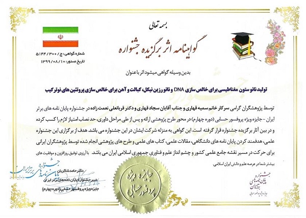 دکتر نعمت زاده گفت: همچنین طرح ” تولید نانوستون مغناطیسی برای خالص سازیDNA و نانورزین نیکل، کبالت و آهن برای خالصسازی پروتئین های نوترکیب” بعنوان طرح برگزیده این جشنواره معرفی شد. این طرح نیز توسط خانم سمیه قهاری و آقای سجاد قهاری و دکتر قربانعلی نعمت زاده (محققین پژوهشکده ژنتیک و زیستفناوری کشاورزی طبرستان) ارائه شده بود.