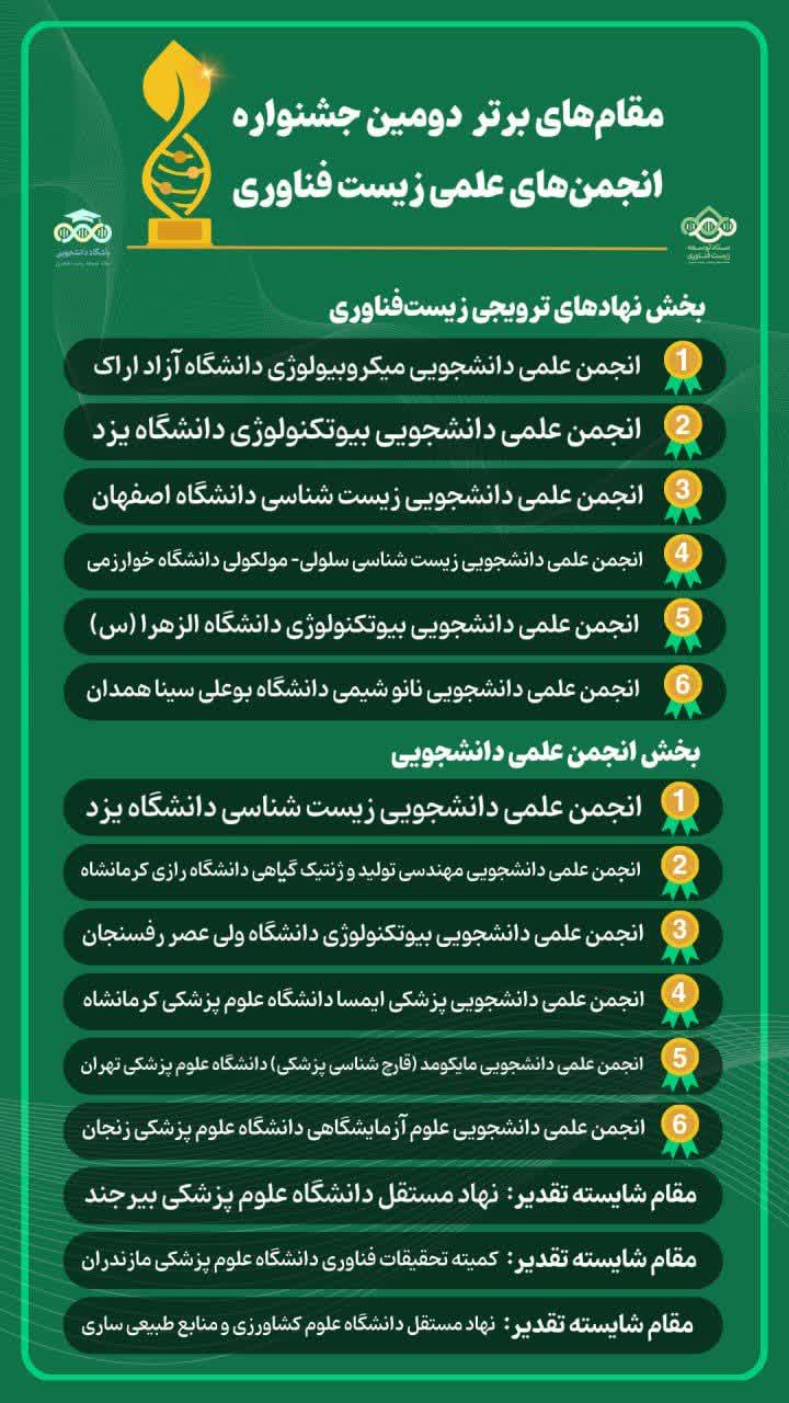 به گزارش روابط عمومی و به نقل از معاونت فرهنگی و اجتماعی دانشگاه، مراسم آیین اختتامیه دومین دوره جشنواره ملی انجمنهای علمی زیست فناوری ستاد توسعه زیستفناوری معاونت علمی، فناوری و اقتصاد دانش بنیان ریاست جمهوری ویژه نهادهای ترویجی زیستفناوری و انجمنهای علمی دانشجویی سراسر کشور در صندوق نوآوری و شکوفایی ریاست جمهوری با معرفی برگزیدگان به کار خود پایان داد.