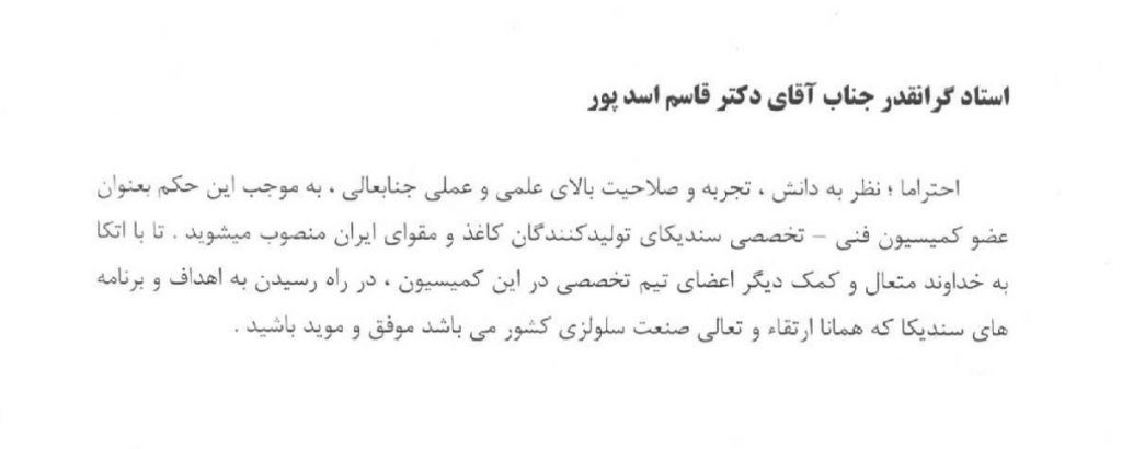 دکتر قاسم اسدپور عضو هیات علمی دانشگاه بعنوان عضو کمیسیون فنی – تخصصی سندیکای تولیدکنندگان کاغذ و مقوای ایران منصوب شد