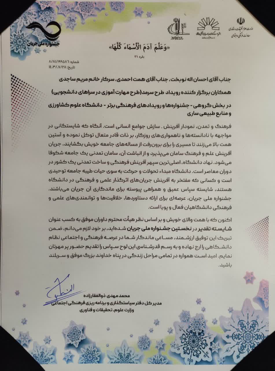 طرح سرمد معاونت فرهنگی و اجتماعی دانشگاه در اولین جشنواره فرهنگی، ملی جریان شاسیته تقدیر شد