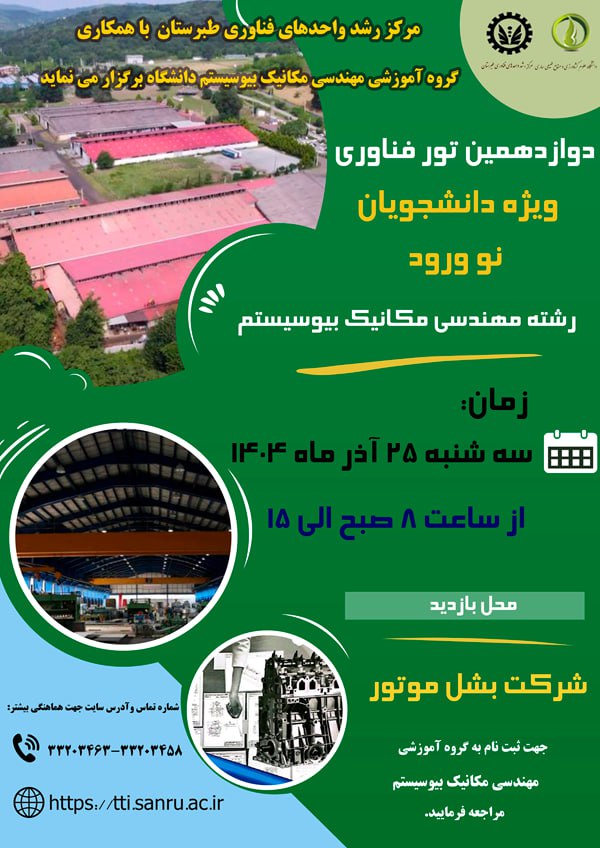 فراخوان دوازدهمین تور فناوری ویژه دانشجویان نوورود مهندسی مکانیک بیوسیستم دانشگاه