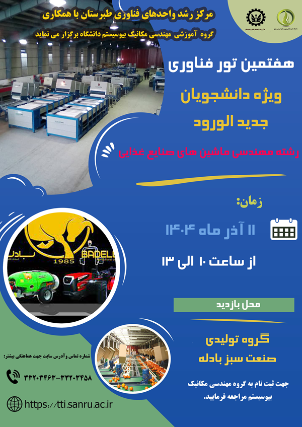 مرکز رشد واحدهای فناوری طبرستان با همکاری گروه آموزشی مهندسی مکانیک بیوسیستم دانشگاه برگزار می نماید: