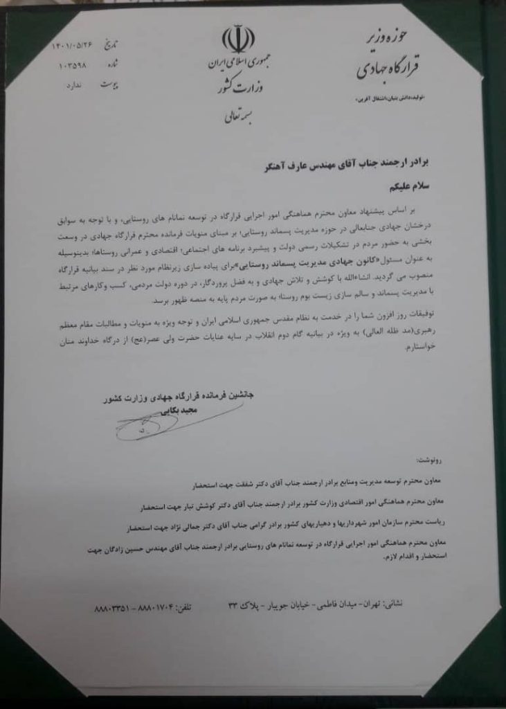 به گزارش روابط‌ عمومی دانشگاه و به نقل از مرکز رشد، عارف آهنگر مدیرعامل شرکت «کیمیاگران پسماند سرزمین پارس» مستقر در مرکز رشد، بر اساس پیشنهاد معاون هماهنگی امور اجرایی قرارگاه جهادی وزارت کشور در توسعه نمانام‌های روستایی به‌عنوان ((مسئول کانون جهادی مدیریت پسماند روستایی کشور)) منصوب شد. این انتصاب در راستای وسعت­ بخشی به حضور مردم شرکت‌های دانش‌بنیان و واحدهای فناور در تشکیلات رسمی دولت و پیشبرد برنامه­های اجتماعی، اقتصادی و عمرانی روستاها صورت پذیرفته است.