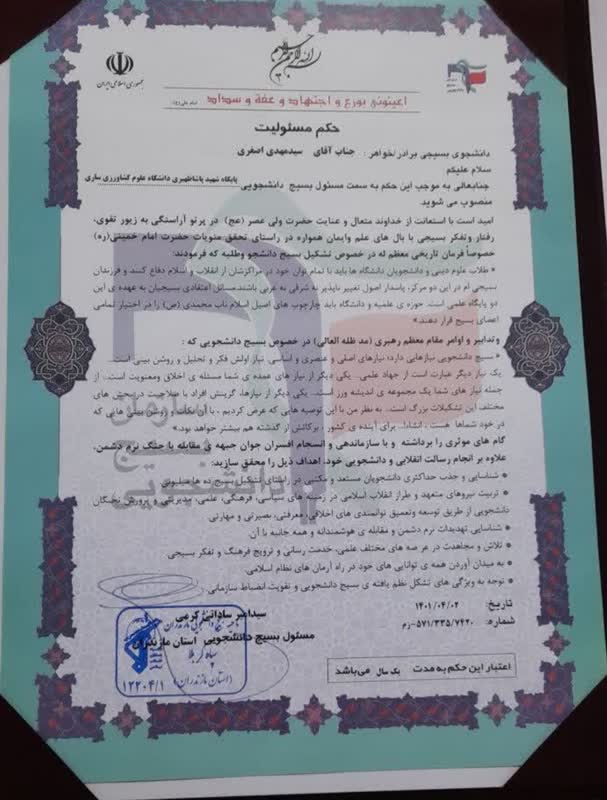 به گزارش روابط عمومی دانشگاه خبرگزاری دانشجو، طی حکمی از سوی سید امیر ساداتی کرمی ، مسئول بسیج دانشجویی استان مازندران سید مهدی اصغری به عنوان مسئول بسیج دانشجویی دانشگاه علوم کشاورزی و منابع طبیعی ساری منصوب شد.