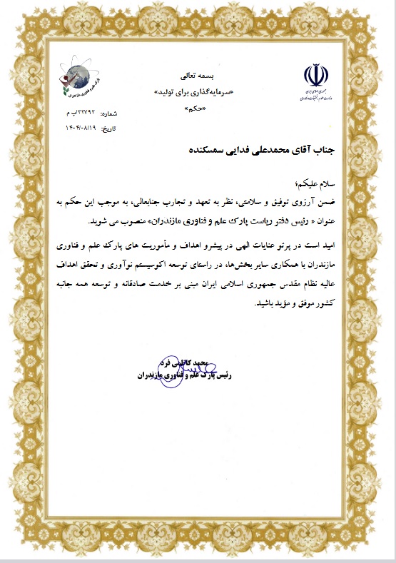 ضمن آرزوی توفيق و سلامتی، نظر به تعهد و تجارب جنابعالی، به موجب این حکم به عنوان «رئیس دفتر ریاست پارک علم و فناوری مازندران» منصوب می‌شوند.