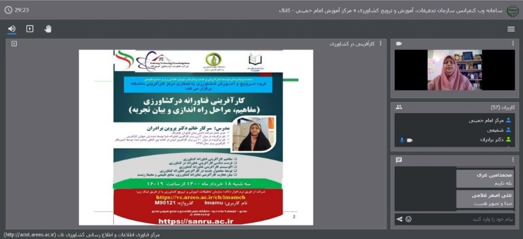 وي اهداف این وبینار را آشنا کردن هر چه بیشتر اعضای هیئت علمی و دانشجویان با این نوع از کارآفرینی و رشد و توسعه کسب و کارهای دانش بنیان و فناورانه کشاورزی و منابع طبیعی عنوان کردند.