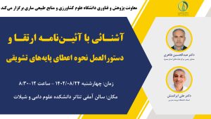 كارگاه آموزشى آييننامه ارتقا و آشنايى با آييننامه يايه تشويقى زمان و مكان برگزارى كارگاه آموزشى: چهارشنبه 1402/08/24 – ساعت 12-8:30، سالن آمفي تئاتر دانشگاه