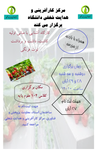 مرکز کارآفرینی و هدایت شغلی دانشگاه برگزار می کند: کارگاه آشنایی با مبانی اولیه کاشت، داشت و برداشت توت فرنگی زمان: ۲۷ و ۲۸ آبان ماه ساعت 10 تا 12 مکان برگزاری: کلاس ۱۰۴ علوم پایه جهت ثبت نام به مرکز کارآفرینی واقع در ساختمان اسناد، معاونت پژوهش و فناوری مراجعه کنید