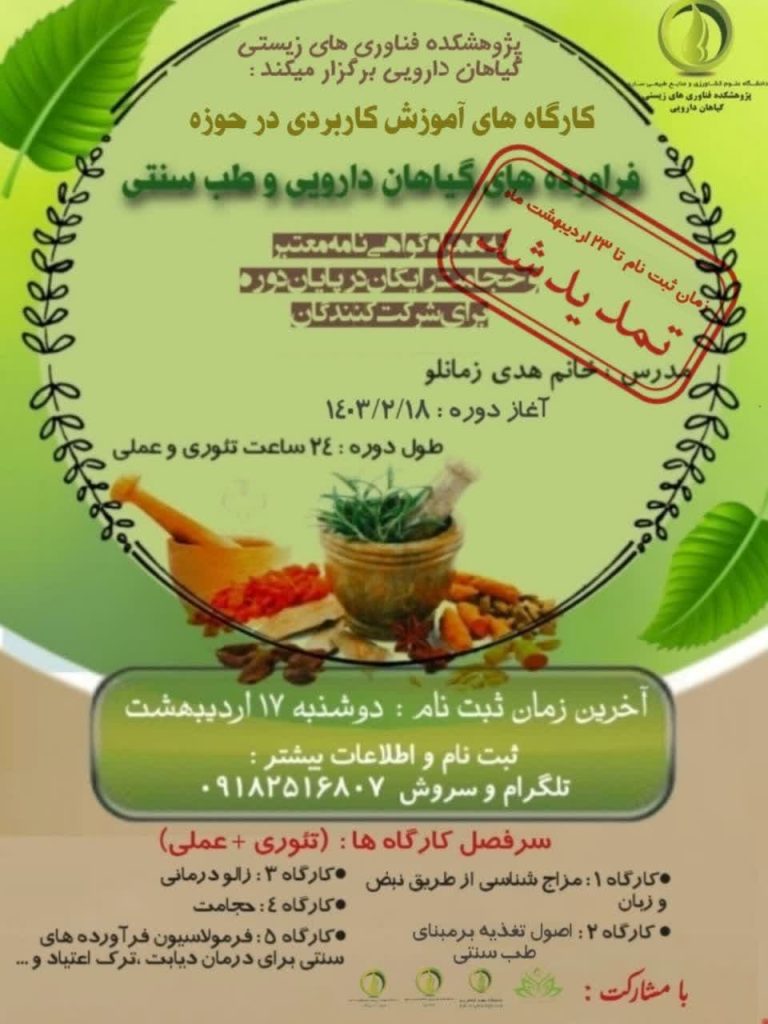 پژوهشکده فناوری های زیستی گیاهان دارویی دانشگاه برگزار می نماید؛کارگاه آموزشی فراورده های گیاهان دارویی و طب سنتی