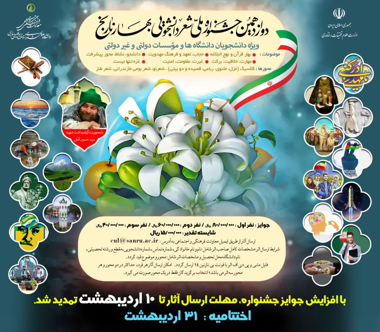 تمدید ارسال آثار و افزایش مبالغ جوایز دوازدهمین دوره جشنواره ملی شعر دانشجویی بهار نارنج دانشگاه علوم کشاورزی و منابع طبیعی ساری