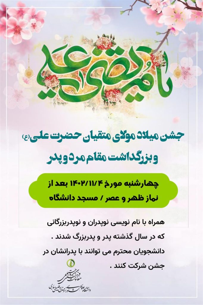 به گزارش روابط عمومی دانشگاه: جشن میلاد مولای متقیان حضرت علی (ع) و بزرگداشت مقام مرد و پدر روز چهارشنبه 4 بهمن ماه 1402 بعد از نماز ظهر و عصر در مسجد دانشگاه برگزار می گردد .